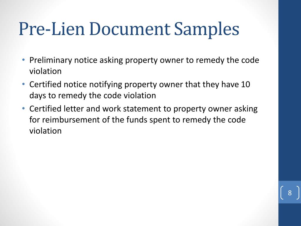 Pre-Lien Document Samples • Preliminary notice asking property owner to remedy the code violation • Certified notice notifying property owner that they have 10 days to remedy the code violation • Certified letter and work statement to property owner asking for reimbursement of the funds spent to remedy the code violation