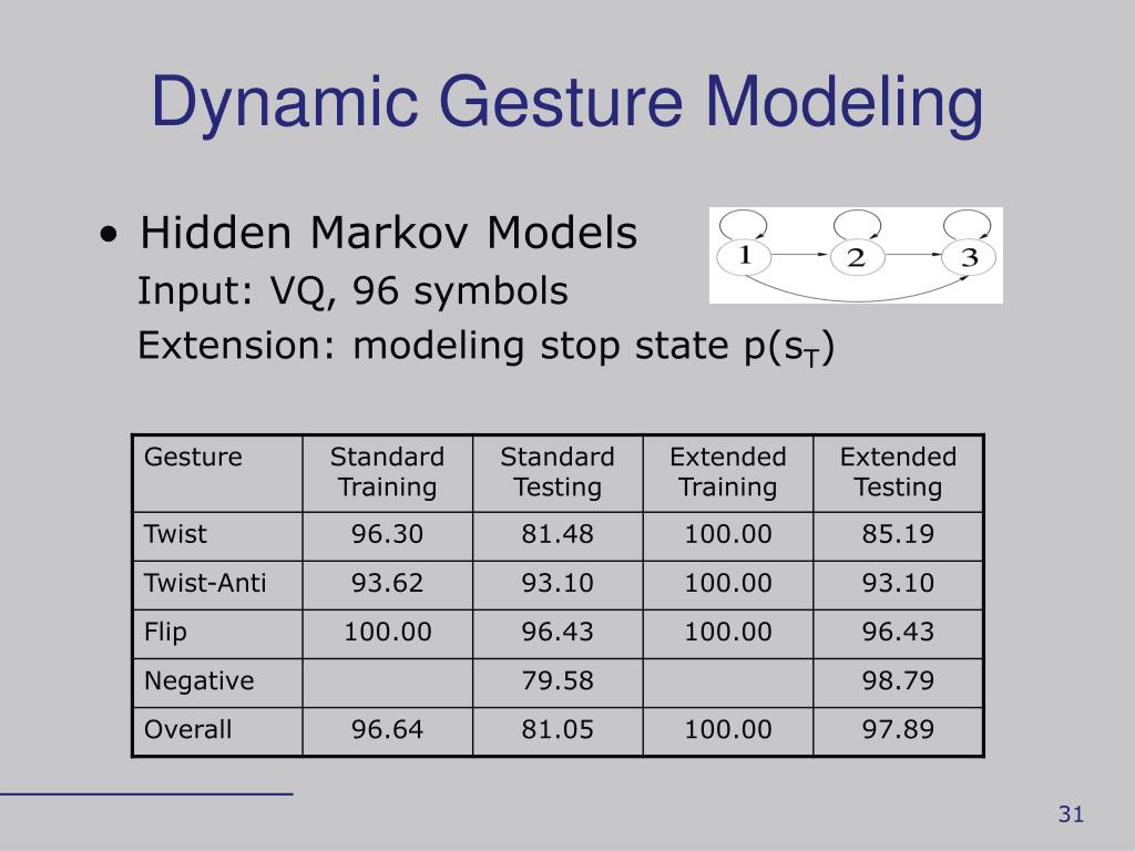 Dynamic Gesture Modeling • Hidden Markov Models Input: VQ, 96 symbols Extension: modeling stop state p(sT)