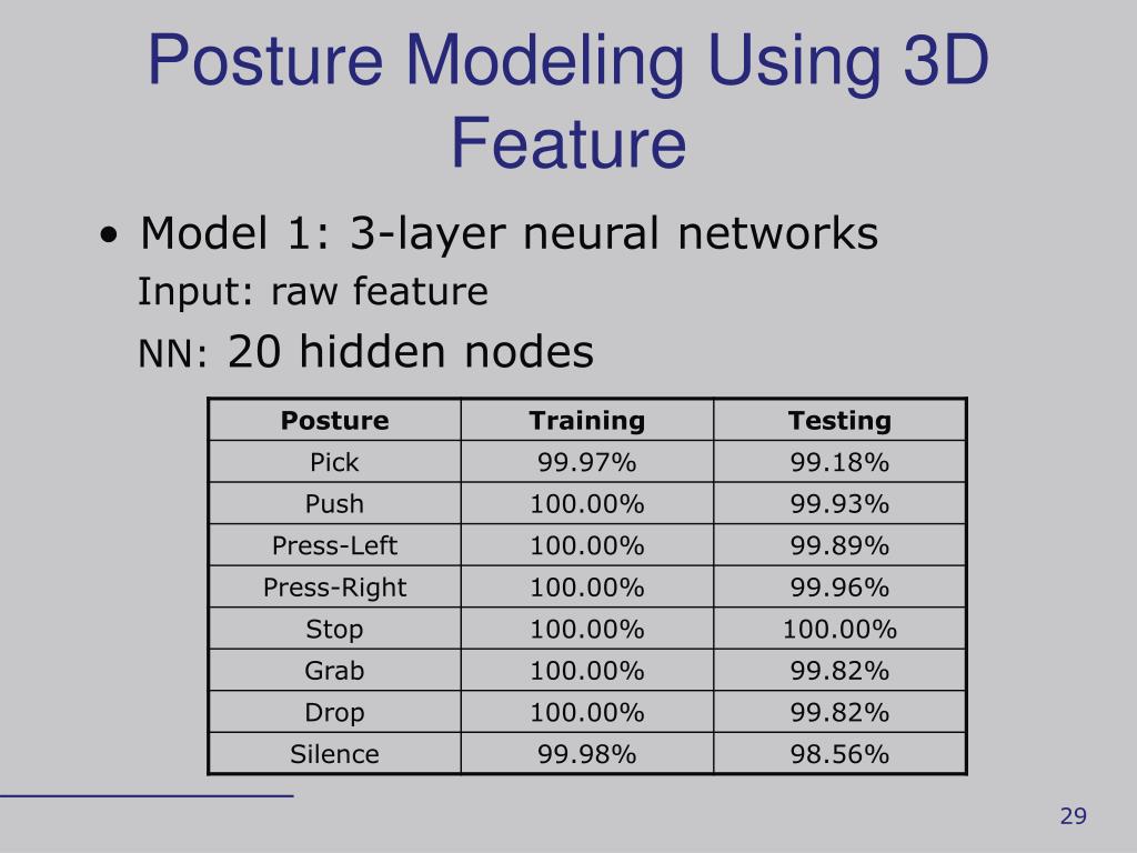 Posture Modeling Using 3D Feature • Model 1: 3-layer neural networks Input: raw feature NN: 20 hidden nodes
