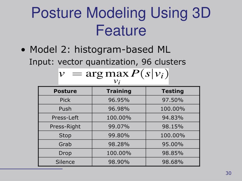Posture Modeling Using 3D Feature • Model 2: histogram-based ML Input: vector quantization, 96 clusters