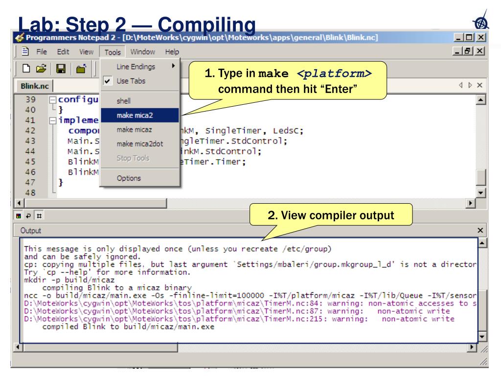Lab: Step 2 -- Compile Compile an application in Programmer’s Notepad • Method 1: Click on Tools > Shell Type make <platform>install and enter into the User Input Parameter dialog box • Method 2: See next slide • Exchange <platform> with one of the following • mica2 • micaz • mica2dot WSN Training: First Steps in nesC Programming