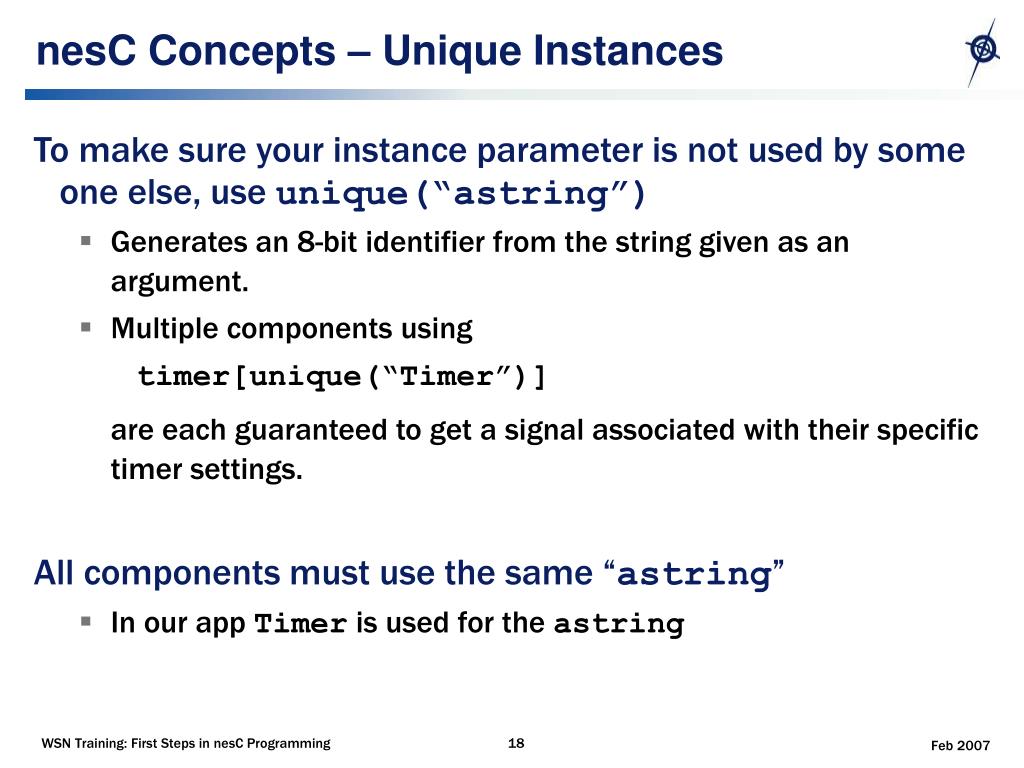 nesC Concepts – Unique Instances • To make sure your instance parameter is not used by some one else, use unique(“astring”) • Generates an 8-bit identifier from the string given as an argument. • Multiple components using timer[unique(“Timer”)] are each guaranteed to get a signal associated with their specific timer settings. • All components must use the same “astring” • In our app Timer is used for the astring WSN Training: First Steps in nesC Programming