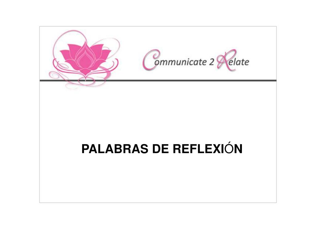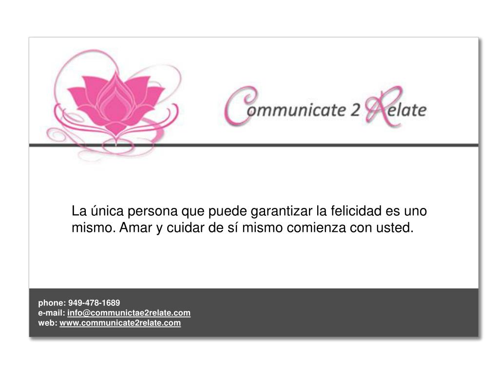 PALABRAS DE REFLEXI Ó N. La única persona que puede garantizar la felicidad es uno mismo. Amar y cuidar de sí mismo comienza con usted. p hone: 949-478-1689 e -mail: info@communicate2relate.com w eb: www.communicate2relate.com. p hone: 949-478-1689 e -mail: info@communictae2relate.com