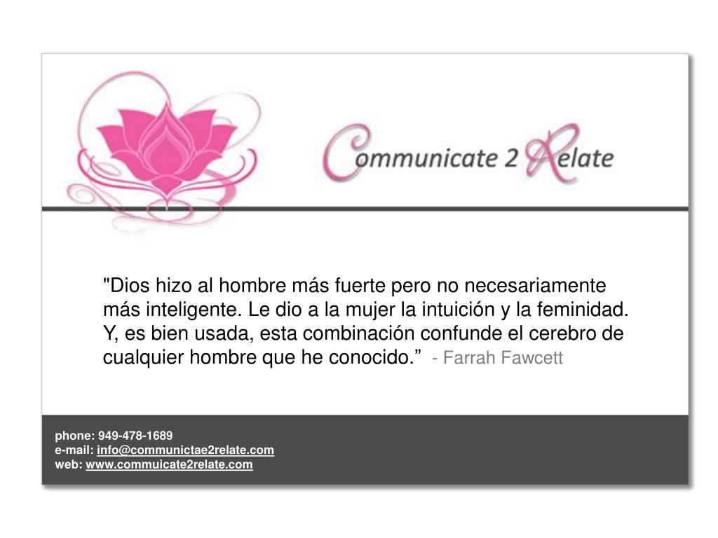 "Dios hizo al hombre más fuerte pero no necesariamente más inteligente. Le dio a la mujer la intuición y la feminidad. Y, es bien usada, esta combinación confunde el cerebro de cualquier hombre que he conocido.”- Farrah Fawcett phone: 949-478-1689 e-mail: info@communictae2relate.com web: www.commuicate2relate.com