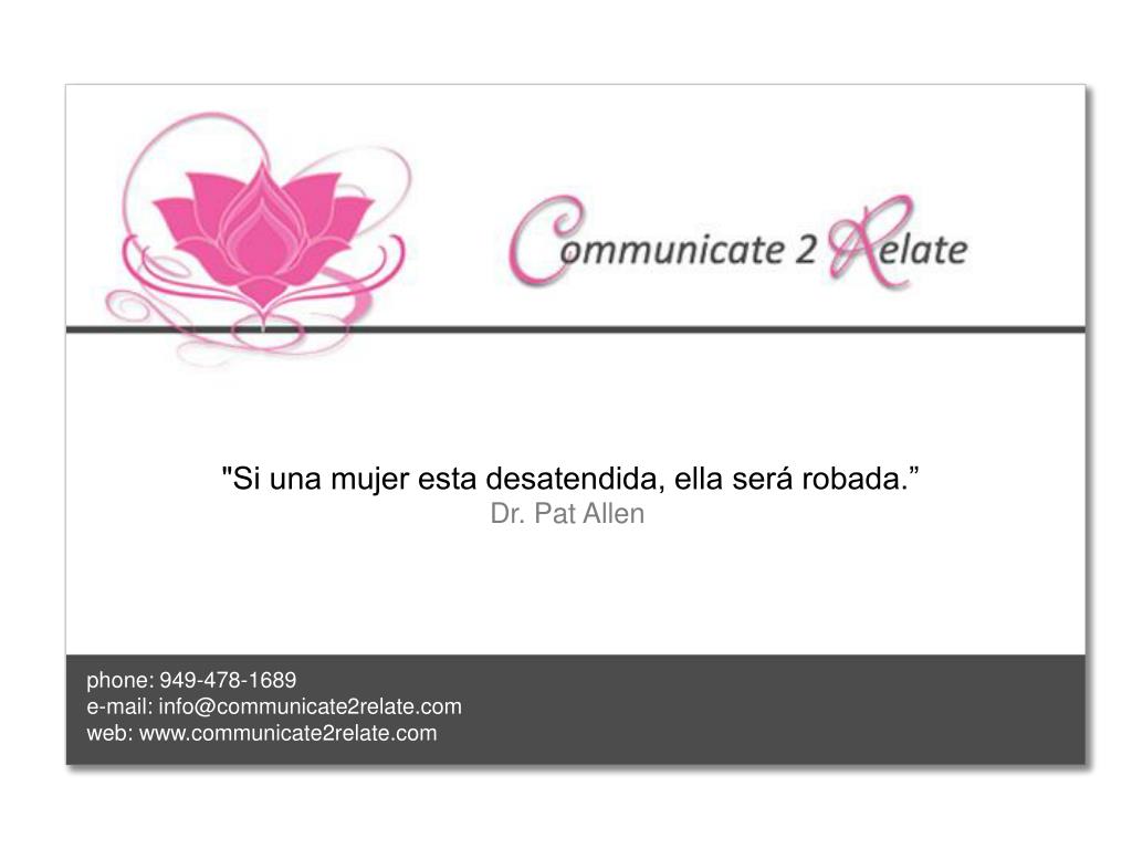"Si una mujer esta desatendida, ella será robada.” • Dr. Pat Allen phone: 949-478-1689 e-mail: info@communicate2relate.com web: www.communicate2relate.com