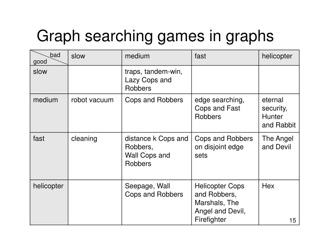 Variety is the spice of life • traps, alarms, technology (Clarke,99,02), (Clarke,Nowakowski,01), (Musson,Tang,11) • tandem-win Cops and Robbers (Clarke,Nowakowski,05) • Complementary Cops and Robbers (Hill,08) • distance k Cops and Robbers (B,Chiniforooshan, Pralat,09), (Chalopin,Chepoi,Nisse,Vaxes,10) • Cops and Fast Robber (Alon,Mehrabian,11), (Frieze, Krivelevich,Loh,12) • play on edges (Dudek, Gordinowicz, Pralat,14) • Lazy Cops and Robbers (Offner, Ojakian,14+), (Bal,B,Kinnersley, Pralat,14+) • Cops and Invisible Robbers (Dierenowski,Dyer,Tifenbach,Yang,14+) • Hunter and Rabbit, (Babichenko,Peres,Peretz,Sousi,Winkler,14+) • Cops vs Gambler (Komarov,Winkler,14+) • Containment (Komarov,Mackey,14+) … Robber Strikes Back Anthony Bonato