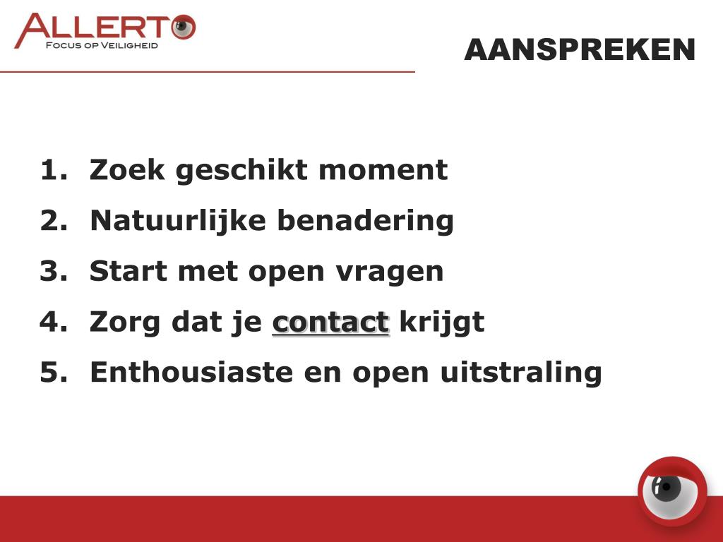 AANSPREKEN Zoek geschikt moment Natuurlijke benadering Start met open vragen Zorg dat je contact krijgt Enthousiaste en open uitstraling