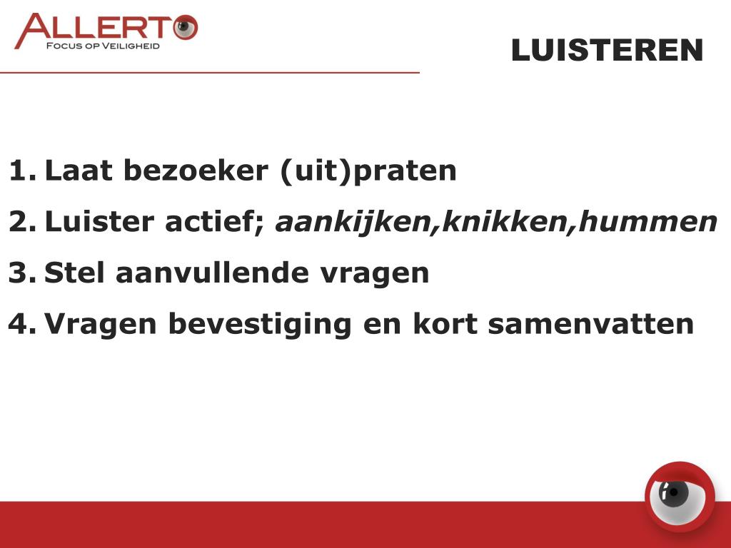 LUISTEREN Laat bezoeker(uit)praten Luister actief; aankijken,knikken,hummen Stel aanvullende vragen Vragen bevestiging en kort samenvatten