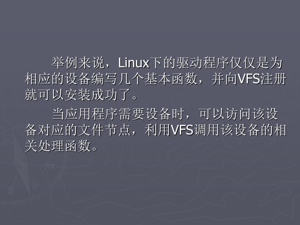 举例来说,Linux下的驱动程序仅仅是为相应的设备编写几个基本函数,并向VFS注册就可以安装成功了。举例来说,Linux下的驱动程序仅仅是为相应的设备编写几个基本函数,并向VFS注册就可以安装成功了。 当应用程序需要设备时,可以访问该设备对应的文件节点,利用VFS调用该设备的相关处理函数。