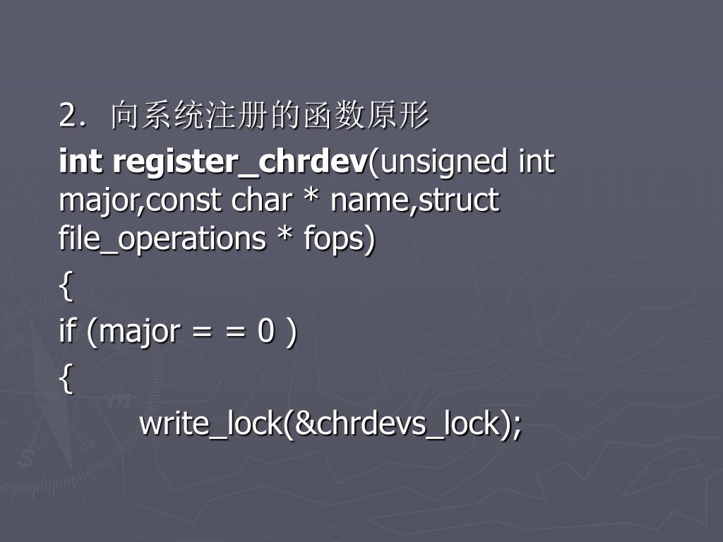 2.向系统注册的函数原形 intregister_chrdev(unsigned int major,const char * name,struct file_operations * fops) { if (major = = 0 ) { write_lock(&chrdevs_lock);