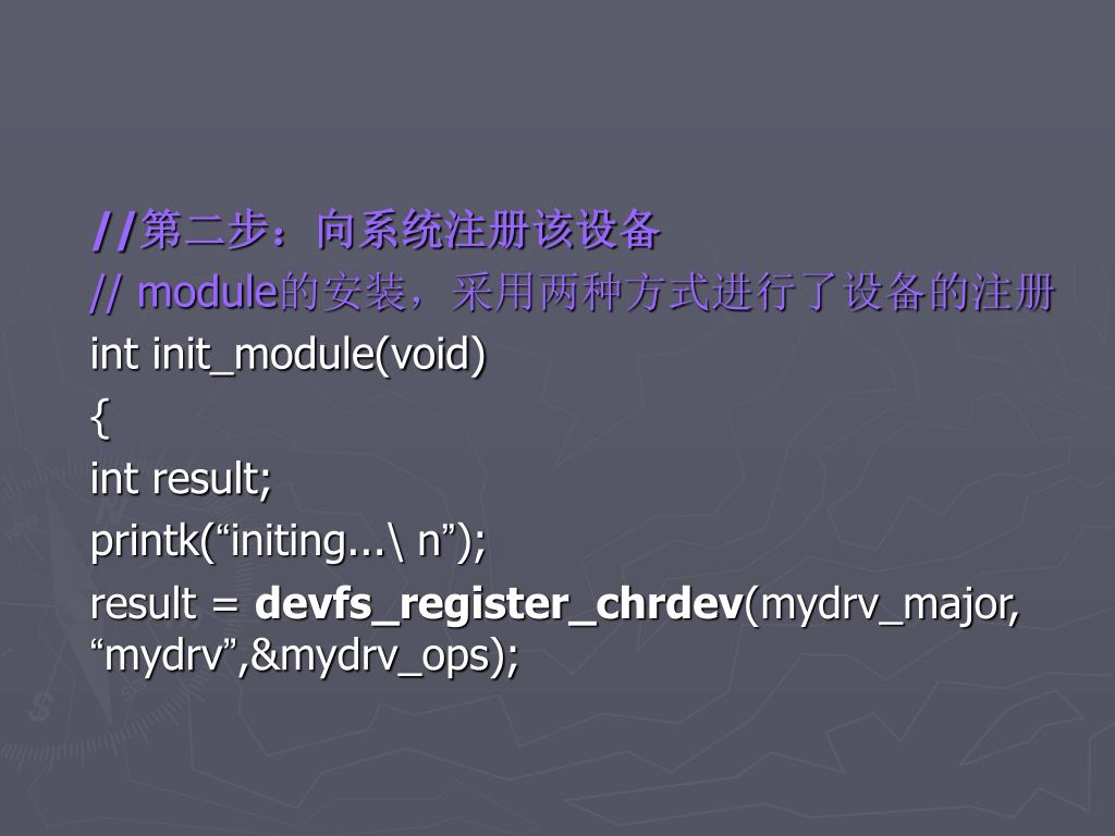 //第二步:向系统注册该设备 // module的安装,采用两种方式进行了设备的注册 int init_module(void) { int result; printk(“initing...\ n”); result = devfs_register_chrdev(mydrv_major, “mydrv”,&mydrv_ops);