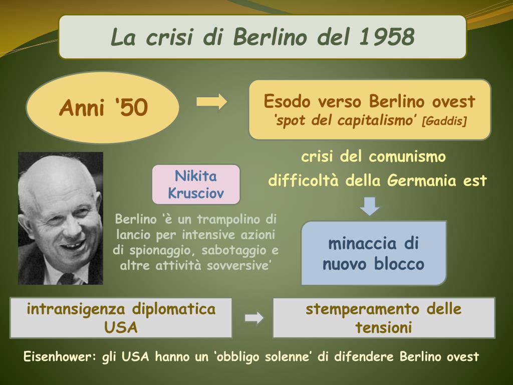 La crisi di Berlino del 1958 Anni ‘50 Esodo verso Berlino ovest ‘spot del capitalismo’ [Gaddis] crisi del comunismo Nikita Krusciov difficoltà della Germania est Berlino ‘è un trampolino di lancio per intensive azioni di spionaggio, sabotaggio e altre attività sovversive’ minaccia di nuovo blocco intransigenza diplomatica USA stemperamento delle tensioni Eisenhower: gli USA hanno un ‘obbligo solenne’ di difendere Berlino ovest