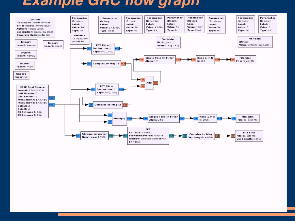 Flowgraphs and GUIs • Lots of different applications built with GNU Radio and various GUI toolkits. • All-mode HF transceiver • RADAR • GPS • Radio Astronomy