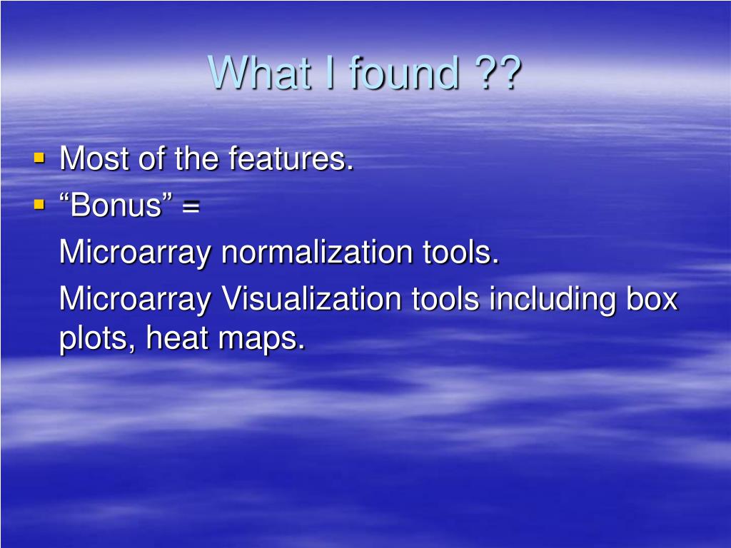 What I found ?? • Most of the features. • “Bonus” = Microarray normalization tools. Microarray Visualization tools including box plots, heat maps.