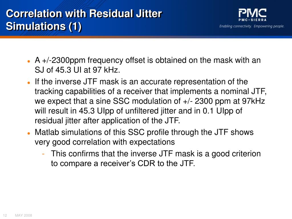 Correlation with Residual Jitter Simulations (1) • A +/-2300ppm frequency offset is obtained on the mask with an SJ of 45.3 UI at 97 kHz. • If the inverse JTF mask is an accurate representation of the tracking capabilities of a receiver that implements a nominal JTF, we expect that a sine SSC modulation of +/- 2300 ppm at 97kHz will result in 45.3 UIpp of unfiltered jitter and in 0.1 UIpp of residual jitter after application of the JTF. • Matlab simulations of this SSC profile through the JTF shows very good correlation with expectations • This confirms that the inverse JTF mask is a good criterion to compare a receiver’s CDR to the JTF.
