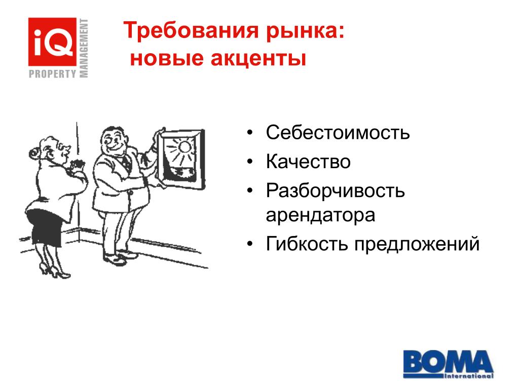 Требования рынка: новые акценты • Себестоимость • Качество • Разборчивость арендатора • Гибкость предложений
