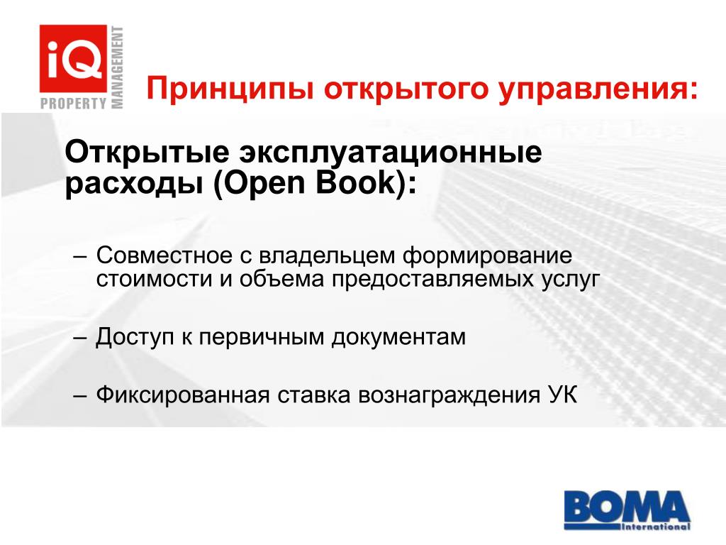 Принципы открытого управления: Открытые эксплуатационные расходы (Open Book): • Совместное с владельцем формирование стоимости и объема предоставляемых услуг • Доступ к первичным документам • Фиксированная ставка вознаграждения УК