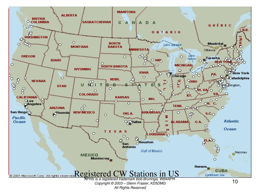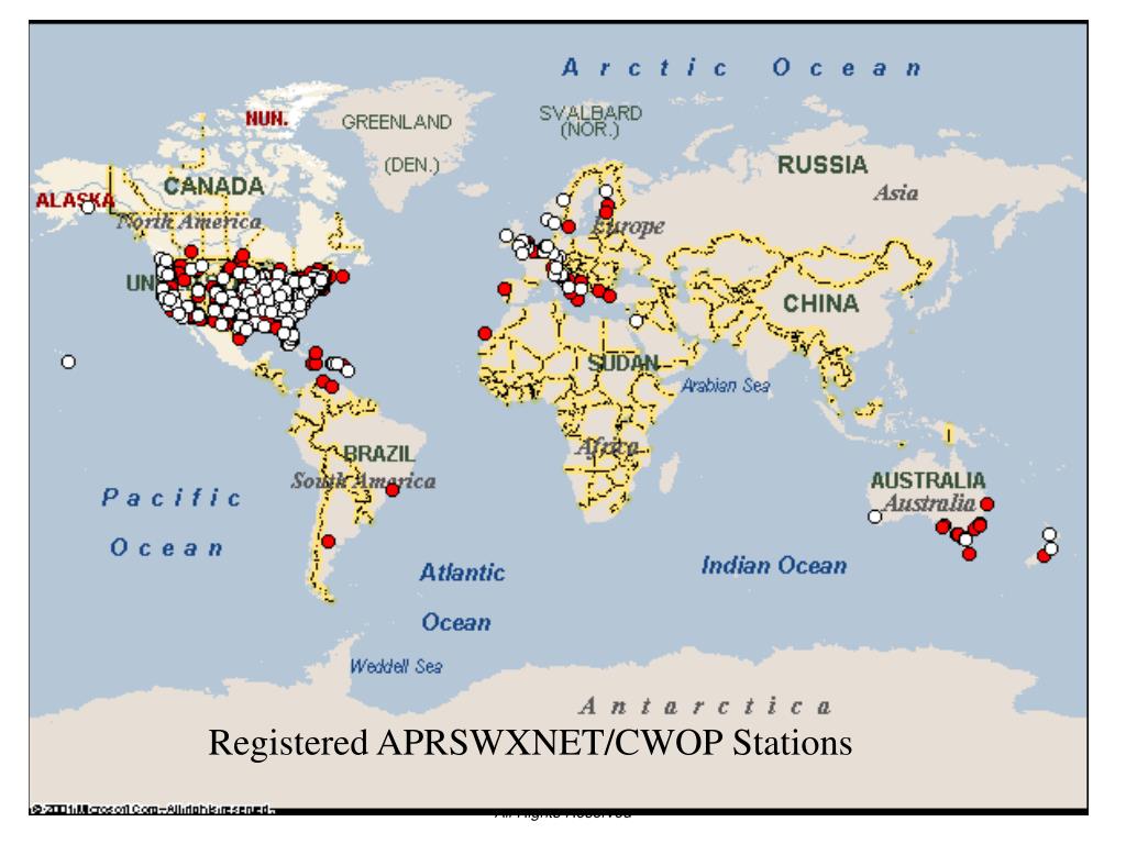 APRSWXNET/CWOP Membership (9/11/02) 1. Registered Hams - 658 total registered - 937 2. Registered CW - 279 3. Unregistered CW - 293 4. Inactive - 74 Each hour 575+ registered stations contributing weather data to NOAA