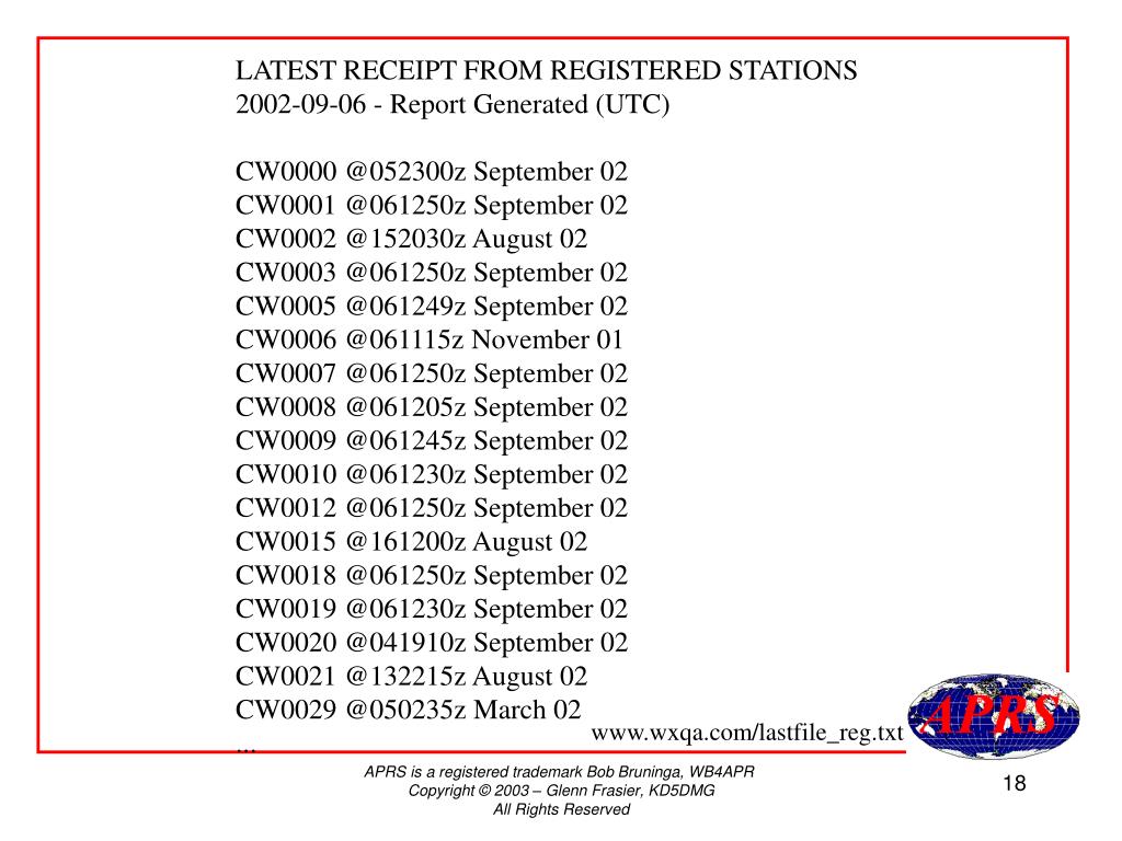 Citizen Weather Feedback to Contributors - Chronological List www.findu.com/citizenweather.html - Ordered list of last packet www.wxqa.com/activecwd/C20020915.txt - Last packet receipt date and time www.wxqa.com/last_reg.txt www.wxqa.com/last_sgn.txt - findu functions, e-mail, web sites www.wxqa.com/stations.html