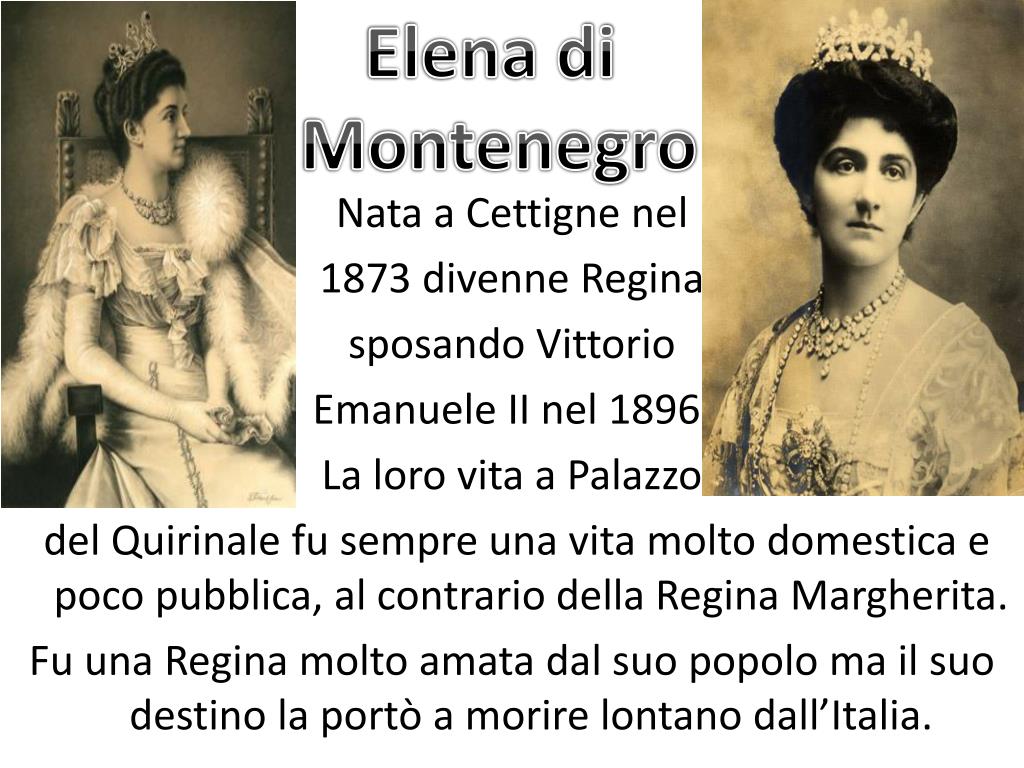 Elena di Montenegro Nata a Cettigne nel 1873 divenne Regina sposando Vittorio Emanuele II nel 1896. La loro vita a Palazzo del Quirinale fu sempre una vita molto domestica e poco pubblica, al contrario della Regina Margherita. Fu una Regina molto amata dal suo popolo ma il suo destino la portò a morire lontano dall’Italia.