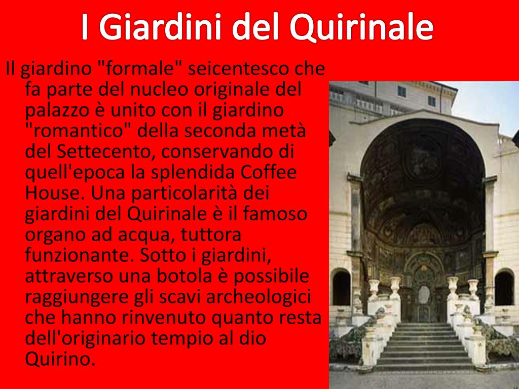 I Giardini del Quirinale Il giardino "formale" seicentesco che fa parte del nucleo originale del palazzo è unito con il giardino "romantico" della seconda metà del Settecento, conservando di quell'epoca la splendida Coffee House. Una particolarità dei giardini del Quirinale è il famoso organo ad acqua, tuttora funzionante. Sotto i giardini, attraverso una botola è possibile raggiungere gli scavi archeologici che hanno rinvenuto quanto resta dell'originario tempio al dio Quirino.