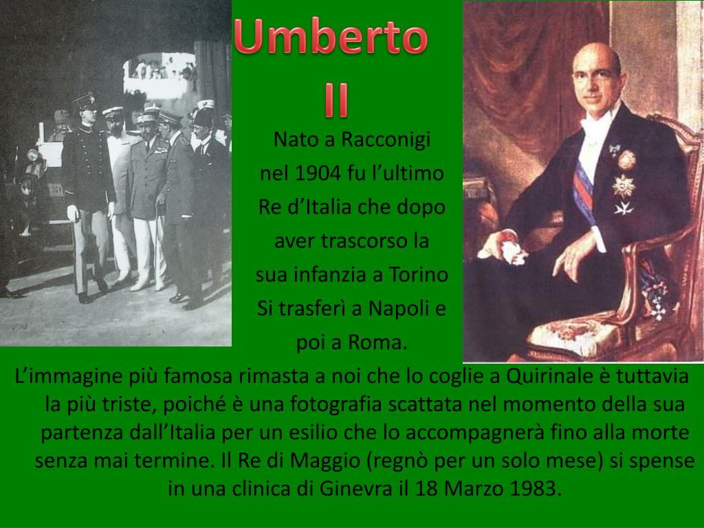 Umberto II Nato a Racconigi nel 1904 fu l’ultimo Re d’Italia che dopo aver trascorso la sua infanzia a Torino Si trasferì a Napoli e poi a Roma. L’immagine più famosa rimasta a noi che lo coglie a Quirinale è tuttavia la più triste, poiché è una fotografia scattata nel momento della sua partenza dall’Italia per un esilio che lo accompagnerà fino alla morte senza mai termine. Il Re di Maggio (regnò per un solo mese) si spense in una clinica di Ginevra il 18 Marzo 1983.