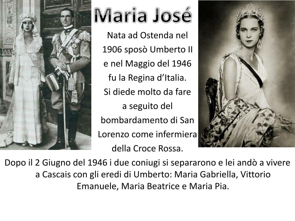 Maria José Nata ad Ostenda nel 1906 sposò Umberto II e nel Maggio del 1946 fu la Regina d’Italia. Si diede molto da fare a seguito del bombardamento di San Lorenzo come infermiera della Croce Rossa. Dopo il 2 Giugno del 1946 i due coniugi si separarono e lei andò a vivere a Cascais con gli eredi di Umberto: Maria Gabriella, Vittorio Emanuele, Maria Beatrice e Maria Pia.