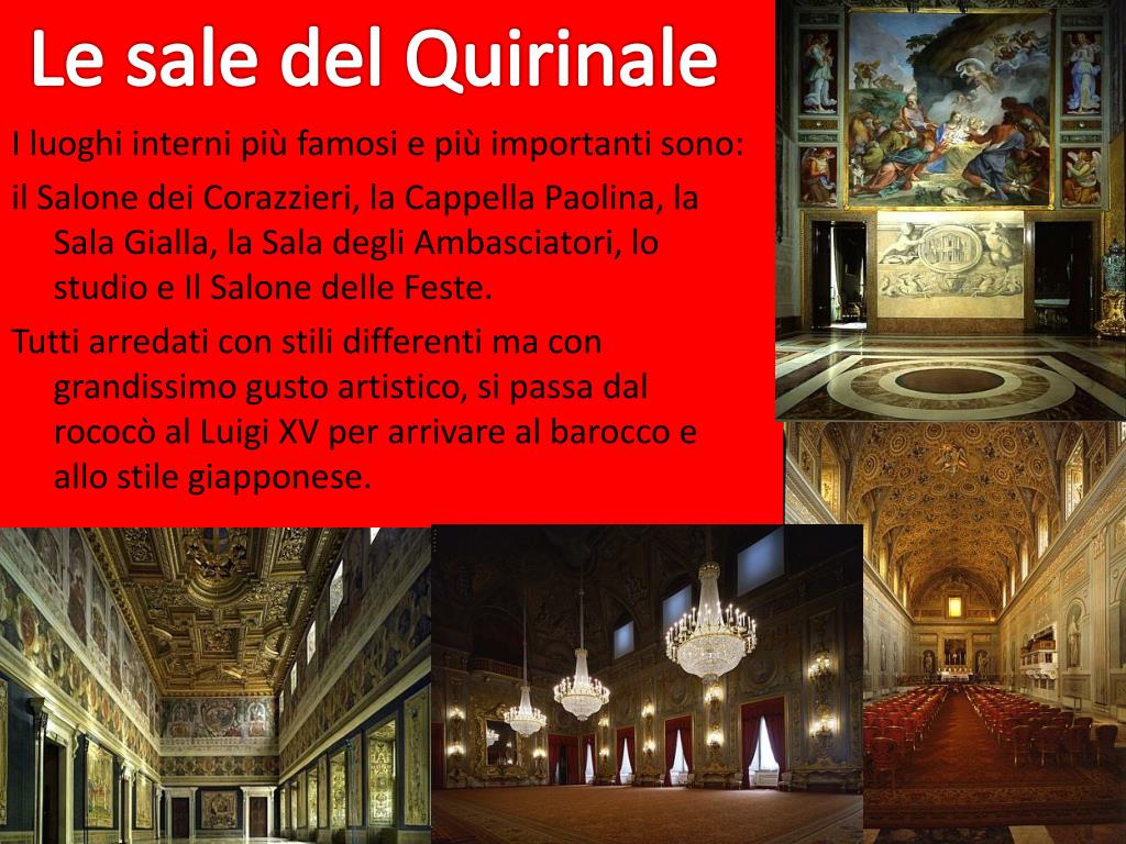 Le sale del Quirinale I luoghi interni più famosi e più importanti sono: il Salone dei Corazzieri, la Cappella Paolina, la Sala Gialla, la Sala degli Ambasciatori, lo studio e Il Salone delle Feste. Tutti arredati con stili differenti ma con grandissimo gusto artistico, si passa dal rococò al Luigi XV per arrivare al barocco e allo stile giapponese.
