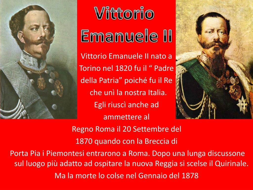 Vittorio Emanuele II Vittorio Emanuele II nato a Torino nel 1820 fu il “ Padre della Patria” poiché fu il Re che unì la nostra Italia. Egli riuscì anche ad ammettere al Regno Roma il 20 Settembre del 1870 quando con la Breccia di Porta Pia i Piemontesi entrarono a Roma. Dopo una lunga discussone sul luogo più adatto ad ospitare la nuova Reggia si scelse il Quirinale. Ma la morte lo colse nel Gennaio del 1878