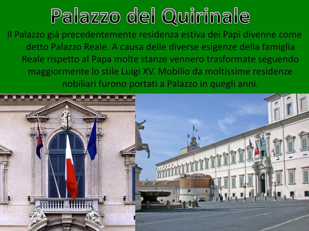 Palazzo del Quirinale Il Palazzo già precedentemente residenza estiva dei Papi divenne come detto Palazzo Reale. A causa delle diverse esigenze della famiglia Reale rispetto al Papa molte stanze vennero trasformate seguendo maggiormente lo stile Luigi XV. Mobilio da moltissime residenze nobiliari furono portati a Palazzo in quegli anni.