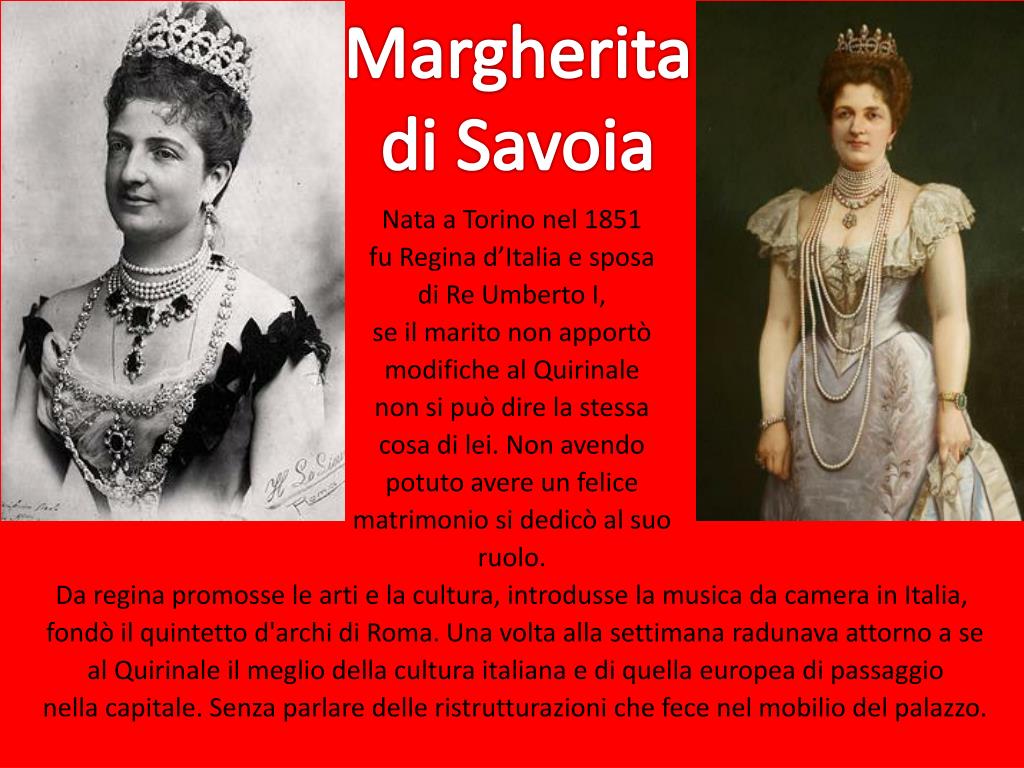 Margherita di Savoia Nata a Torino nel 1851 fu Regina d’Italia e sposa di Re Umberto I, se il marito non apportò modifiche al Quirinale non si può dire la stessa cosa di lei. Non avendo potuto avere un felice matrimonio si dedicò al suo ruolo. Da regina promosse le arti e la cultura, introdusse la musica da camera in Italia, fondò il quintetto d'archi di Roma. Una volta alla settimana radunava attorno a se al Quirinale il meglio della cultura italiana e di quella europea di passaggio nella capitale. Senza parlare delle ristrutturazioni che fece nel mobilio del palazzo.