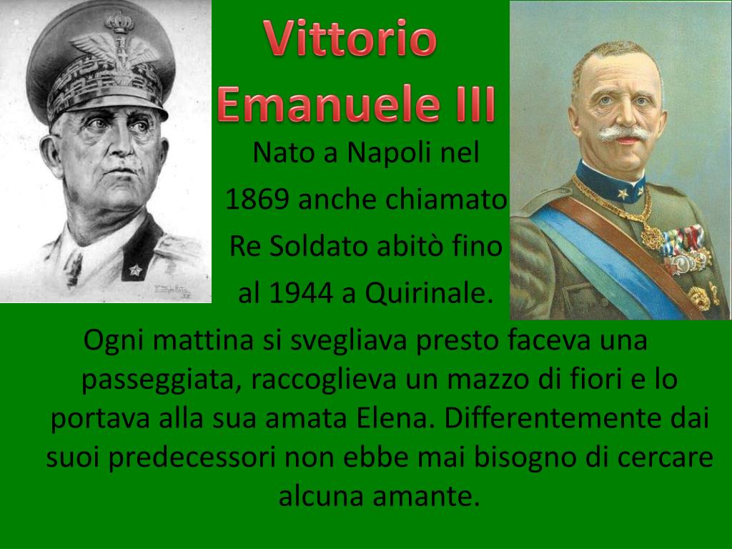 Vittorio Emanuele III Nato a Napoli nel 1869 anche chiamato Re Soldato abitò fino al 1944 a Quirinale. Ogni mattina si svegliava presto faceva una passeggiata, raccoglieva un mazzo di fiori e lo portava alla sua amata Elena. Differentemente dai suoi predecessori non ebbe mai bisogno di cercare alcuna amante.