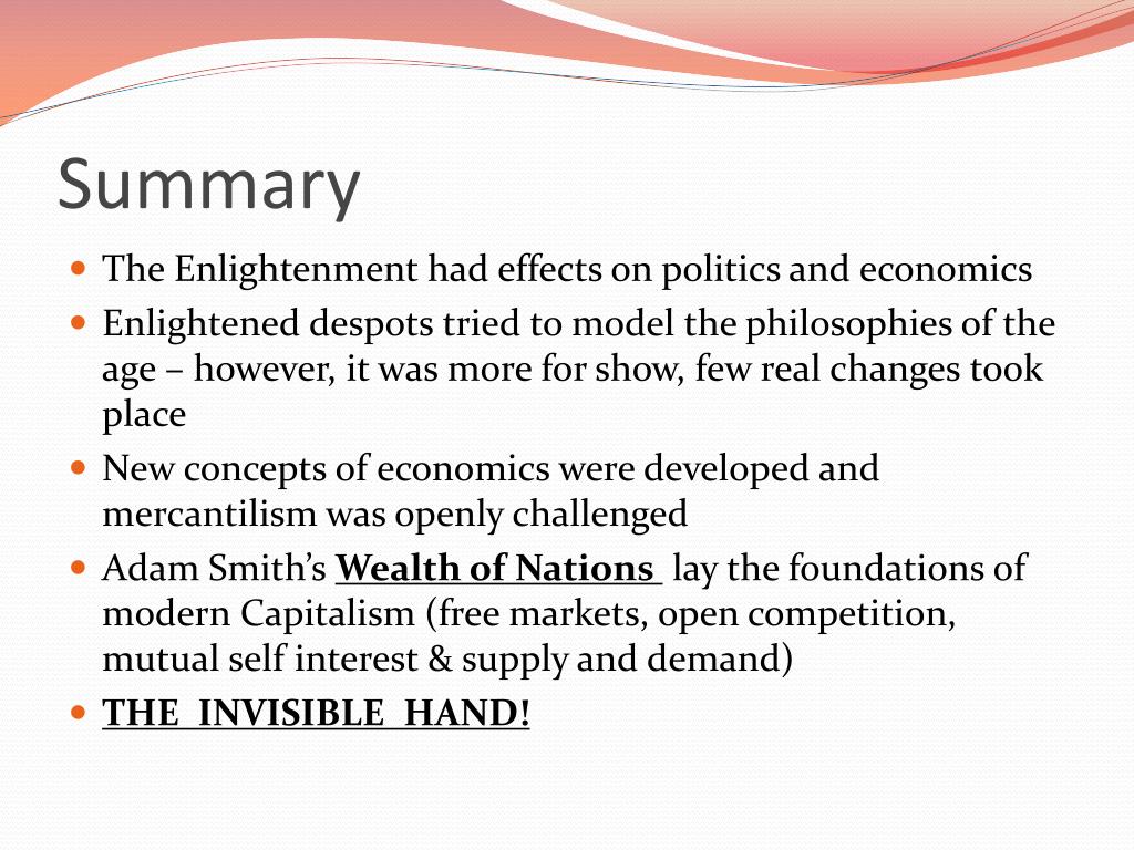 Summary • The Enlightenment had effects on politics and economics • Enlightened despots tried to model the philosophies of the age – however, it was more for show, few real changes took place • New concepts of economics were developed and mercantilism was openly challenged • Adam Smith’s Wealth of Nations lay the foundations of modern Capitalism (free markets, open competition, mutual self interest & supply and demand) • THE INVISIBLE HAND!