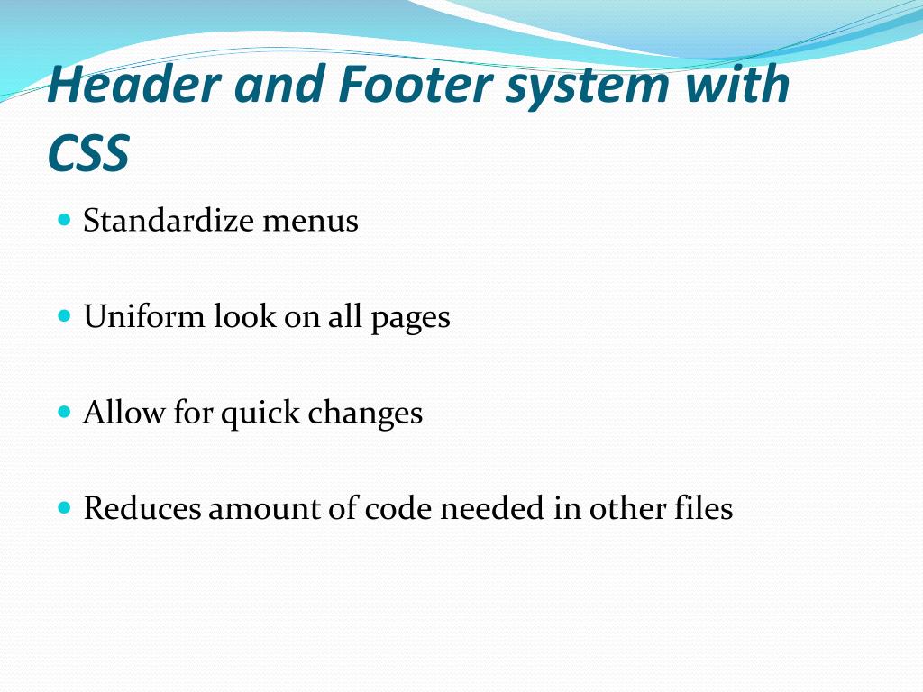 Header and Footer system with CSS • Standardize menus • Uniform look on all pages • Allow for quick changes • Reduces amount of code needed in other files