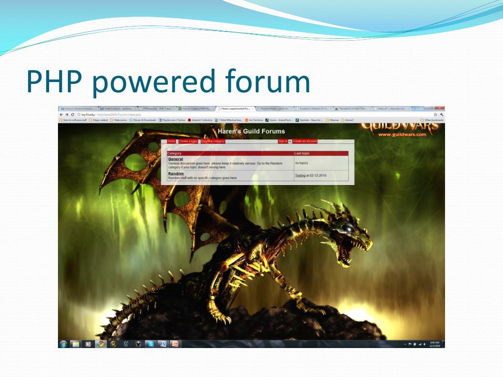 ECE 3553 Multifarious systems Final Project. Haren Lalchand. PHP powered forum. Purpose. Possibly learn more advanced PHP and SQL through relational tables Figure out how a forum really works Standard in most large websites Mostly taken for granted. Implementation. Tables. List of files.