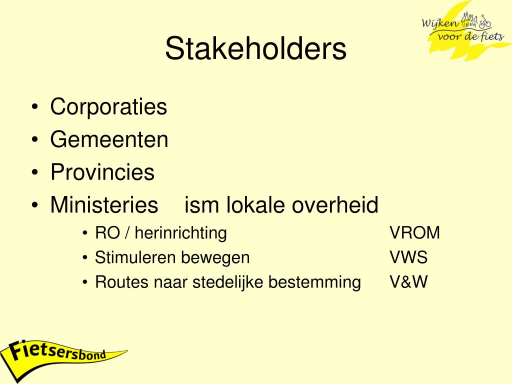 Stakeholders • Corporaties • Gemeenten • Provincies • Ministeries ism lokale overheid • RO / herinrichting VROM • Stimuleren bewegen VWS • Routes naar stedelijke bestemming V&W