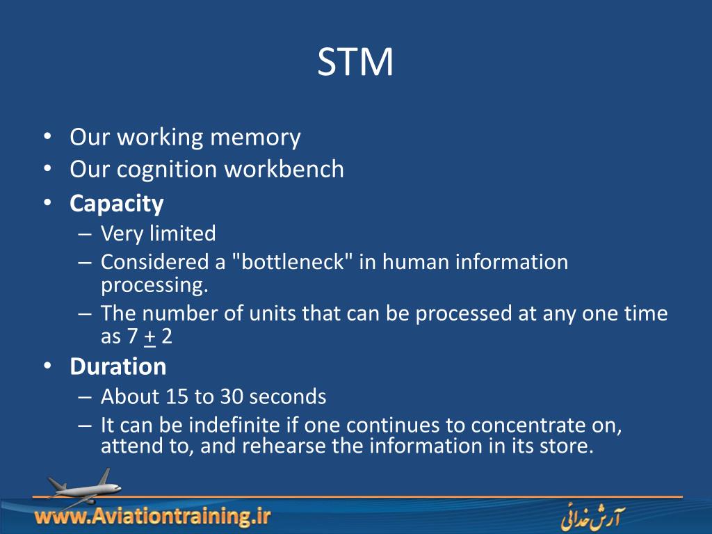 STM • Our working memory • Our cognition workbench • Capacity • Very limited • Considered a "bottleneck" in human information processing. • The number of units that can be processed at any one time as 7+2 • Duration • About 15 to 30 seconds • It can be indefinite if one continues to concentrate on, attend to, and rehearse the information in its store.