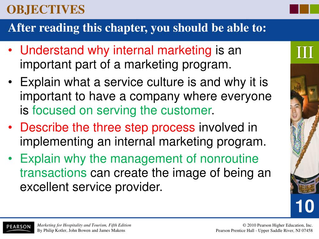 OBJECTIVES After reading this chapter, you should be able to: • Understand why internal marketing is an important part of a marketing program. • Explain what a service culture is and why it is important to have a company where everyoneis focused on serving the customer. • Describe the three step process involved in implementing an internal marketing program. • Explain why the management of nonroutine transactions can create the image of being an excellent service provider.