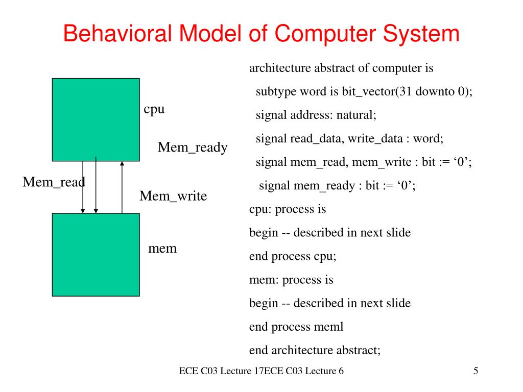 Model of Computer System (Contd) cpu: process is variable instr_reg, PC : word; begin loop address <= PC; mem_read <= ‘1’; wait until mem_ready = ‘1’; PC := PC + 4; -- variable assignment, not a signal; … --- execute instruction end loop; end process cpu; ECE C03 Lecture 17ECE C03 Lecture 6