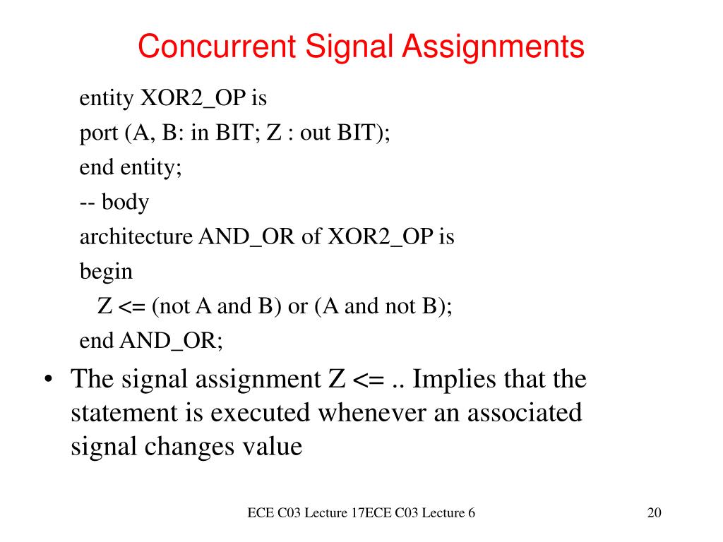 Concurrent Signal Assignments entity XOR2_OP is port (A, B: in BIT; Z : out BIT); end entity; -- body architecture AND_OR of XOR2_OP is begin Z <= (not A and B) or (A and not B); end AND_OR; • The signal assignment Z <= .. Implies that the statement is executed whenever an associated signal changes value ECE C03 Lecture 17ECE C03 Lecture 6
