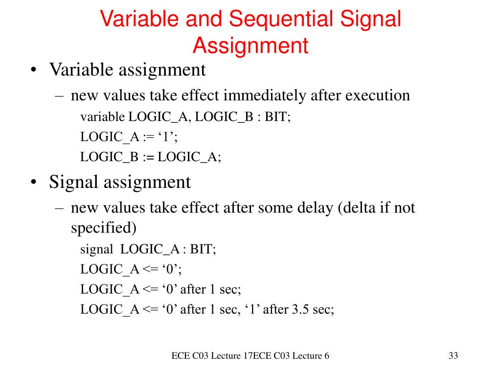 Concurrent and Sequential Statements CONCURRENT: block begin COMM_BUS <= ‘1’; -- concurrent signal assignment DATA_BUS <= ‘0’; -- concurrent signal assignment end block CONCURRENT; SEQUENTIAL: process begin COMM_BUS <= ‘1’; -- sequential signal assignment DATA_BUS <= ‘0’; -- sequential signal assignment end process SEQUENTIAL; ECE C03 Lecture 17ECE C03 Lecture 6