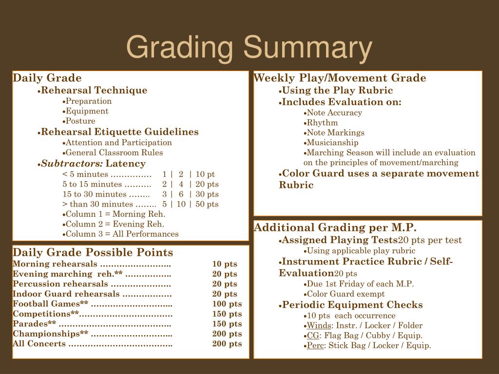Grading Summary • Daily Grade • Rehearsal Technique • Preparation • Equipment • Posture • Rehearsal Etiquette Guidelines • Attention and Participation • General Classroom Rules • Subtractors: Latency • < 5 minutes …………… 1 | 2 | 10 pt 5 to 15 minutes ………. 2 | 4 | 20 pts 15 to 30 minutes …….. 3 | 6 | 30 pts > than 30 minutes …….. 5 | 10 | 50 pts • Column 1 = Morning Reh. • Column 2 = Evening Reh. • Column 3 = All Performances • Weekly Play/Movement Grade • Using the Play Rubric • Includes Evaluation on: • Note Accuracy • Rhythm • Note Markings • Musicianship • Marching Season will include an evaluation on the principles of movement/marching • Color Guard uses a separate movement Rubric • Additional Grading per M.P. • Assigned Playing Tests20 pts per test • Using applicable play rubric • Instrument Practice Rubric / Self-Evaluation20 pts • Due 1st Friday of each M.P. • Color Guard exempt • Periodic Equipment Checks • 10 pts each occurrence • Winds: Instr. / Locker / Folder • CG: Flag Bag / Cubby / Equip. • Perc: Stick Bag / Locker / Equip. Daily Grade Possible Points Morning rehearsals …………………….. 10 ptsEvening marching reh.** …………….. 20 ptsPercussion rehearsals …………………. 20 ptsIndoor Guard rehearsals ……………… 20 ptsFootball Games** ………………………... 100 ptsCompetitions**……………………………. 150 ptsParades** ………………………………….. 150 ptsChampionships** ………………………... 200 ptsAll Concerts ……………………………….. 200 pts