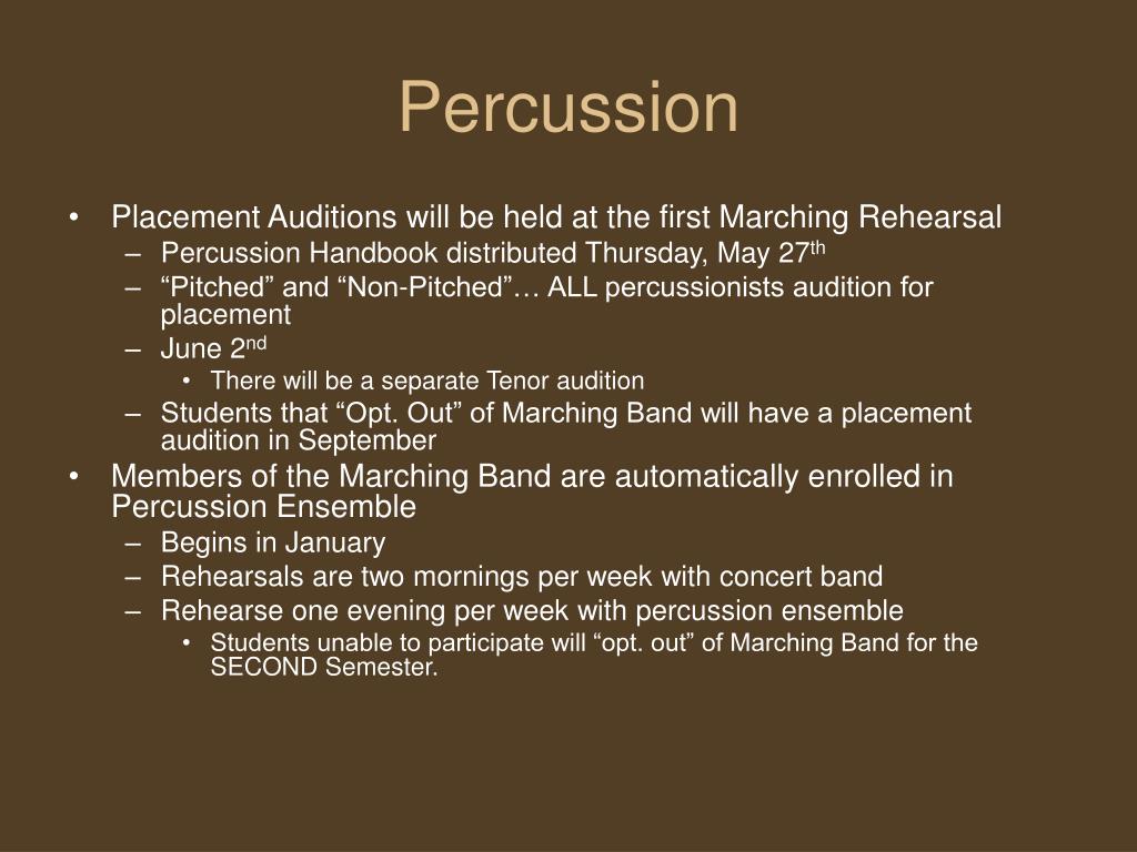 Percussion • Placement Auditions will be held at the first Marching Rehearsal • Percussion Handbook distributed Thursday, May 27th • “Pitched” and “Non-Pitched”… ALL percussionists audition for placement • June 2nd • There will be a separate Tenor audition • Students that “Opt. Out” of Marching Band will have a placement audition in September • Members of the Marching Band are automatically enrolled in Percussion Ensemble • Begins in January • Rehearsals are two mornings per week with concert band • Rehearse one evening per week with percussion ensemble • Students unable to participate will “opt. out” of Marching Band for the SECOND Semester.
