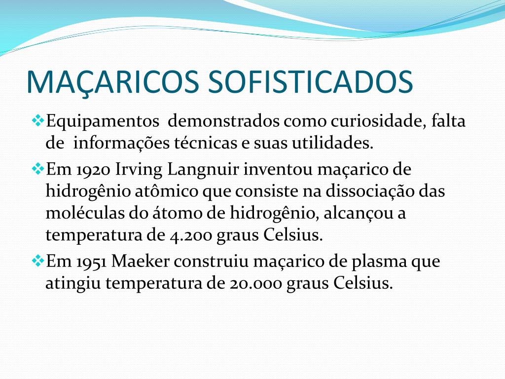 MAÇARICOS SOFISTICADOS • Equipamentos demonstrados como curiosidade, falta de informações técnicas e suas utilidades. • Em 1920 Irving Langnuir inventou maçarico de hidrogênio atômico que consiste na dissociação das moléculas do átomo de hidrogênio, alcançou a temperatura de 4.200 graus Celsius. • Em 1951 Maeker construiu maçarico de plasma que atingiu temperatura de 20.000 graus Celsius.