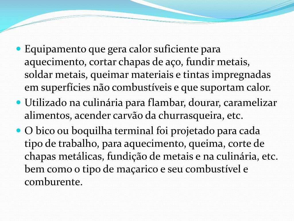 O MAÇARICO. Equipamento que gera calor suficiente para aquecimento, cortar chapas de aço, fundir metais, soldar metais, queimar materiais e tintas impregnadas em superfícies não combustíveis e que suportam calor.