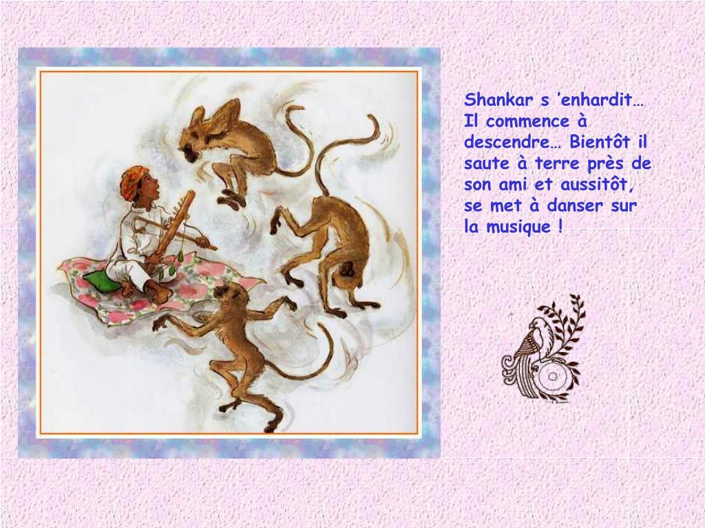 Shankar s ’enhardit… Il commence à descendre… Bientôt il saute à terre près de son ami et aussitôt, se met à danser sur la musique !