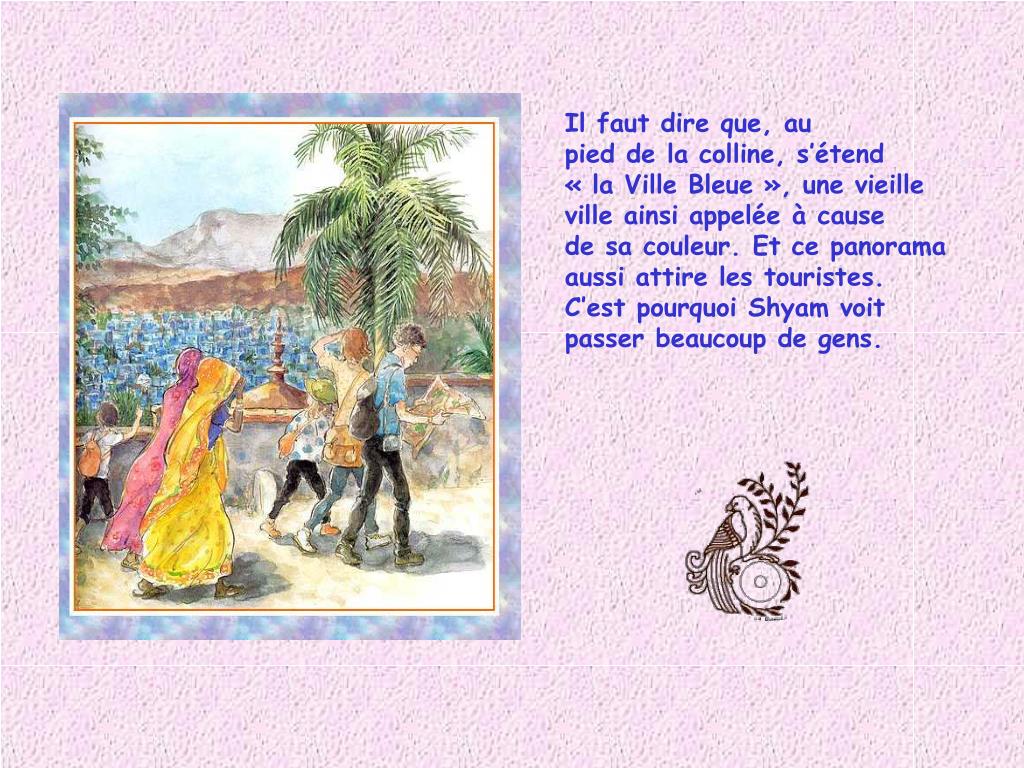 Il faut dire que, au pied de la colline, s’étend « la Ville Bleue », une vieille ville ainsi appelée à cause de sa couleur. Et ce panorama aussi attire les touristes. C’est pourquoi Shyam voit passer beaucoup de gens.