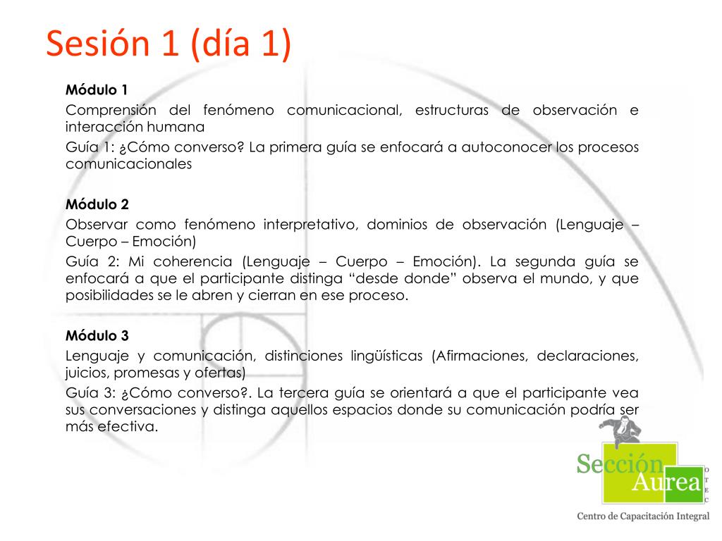 Sesión 1 (día 1) Módulo 1 Comprensión del fenómeno comunicacional, estructuras de observación e interacción humana Guía 1: ¿Cómo converso? La primera guía se enfocará a autoconocer los procesos comunicacionales Módulo 2 Observar como fenómeno interpretativo, dominios de observación (Lenguaje – Cuerpo – Emoción) Guía 2: Mi coherencia (Lenguaje – Cuerpo – Emoción). La segunda guía se enfocará a que el participante distinga “desde donde” observa el mundo, y que posibilidades se le abren y cierran en ese proceso. Módulo 3 Lenguaje y comunicación, distinciones lingüísticas (Afirmaciones, declaraciones, juicios, promesas y ofertas) Guía 3: ¿Cómo converso?. La tercera guía se orientará a que el participante vea sus conversaciones y distinga aquellos espacios donde su comunicación podría ser más efectiva.