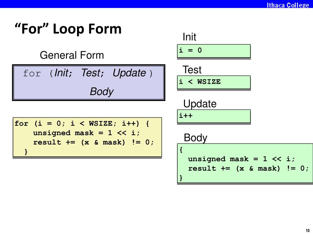 “For” Loop Form Init i = 0 General Form Test for (Init; Test; Update ) Body i < WSIZE Update i++ for (i = 0; i < WSIZE; i++) { unsigned mask = 1 << i; result += (x & mask) != 0; } Body { unsigned mask = 1 << i; result += (x & mask) != 0; }