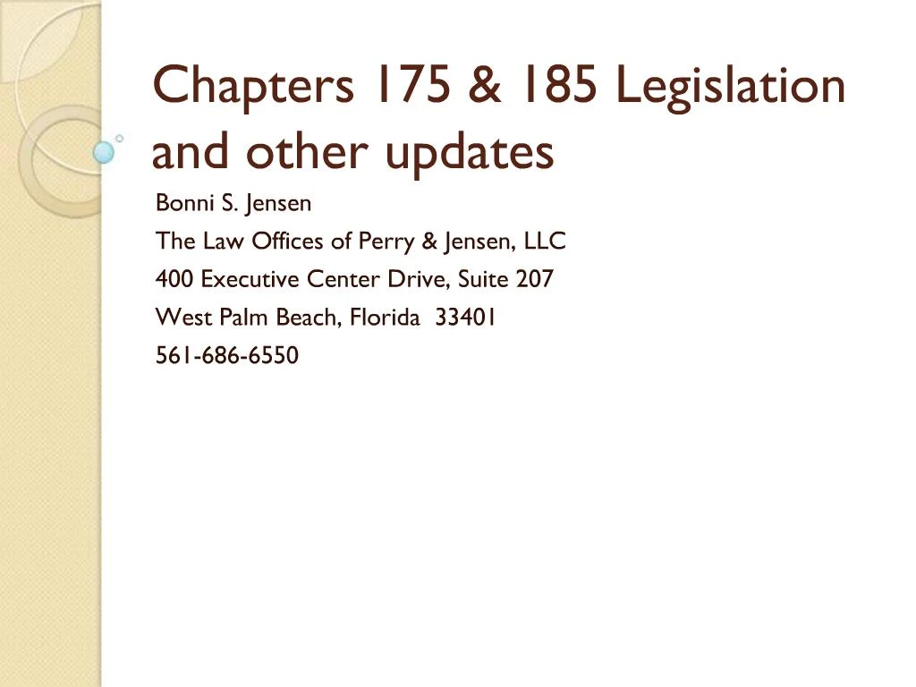 1. Chapters 175 & 185 Legislation and other updates Bonni S. Jensen